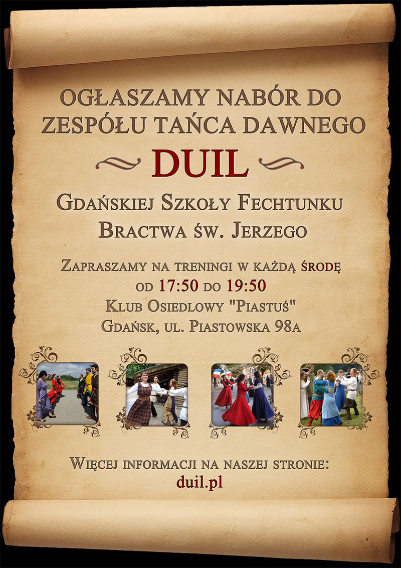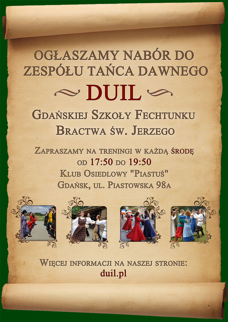 Oficjalne Otwarcie Strony Gdańskiej Szkoły Fechtunku Bractwa św. Jerzego Opublikowany 1 stycznia 2014 przez GSF Treningi tańca Zespołu Tańca Dawnego DUIL Gdańskiej Szkoły Fechtunku Bractwa św. Jerzego Odbywają się w każdą środę od 18:00 do 20:00 Klub Osiedlowy “Piastuś” Gdańsk, ul. Piastowska 98a Nabór prowadzimy cały rok. Chętnych serdecznie zapraszamy.